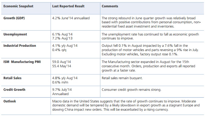 As expected the March quarter contraction in the United States was transitory as severe winter weather disrupted production. In the June quarter, growth rebounded sharply, growing at an annual rate of about 4%. The underlying fundamentals of this recovery are relatively robust. Job creation remains moderate with employment continuing to fall. Credit growth is strong and businesses are reporting faster growth in new orders and production. The withdrawal of Quantitative Easing in October provides further proof of the sustainability of the US recovery.