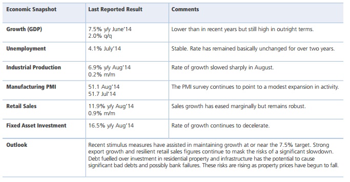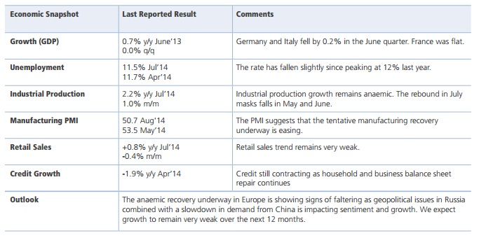 Across the Atlantic however the encouraging signs of a recovery have all but disappeared. Economic growth in the Eurozone has slowed to 0.2% in the June quarter. Germany and Italy contracted over the period while France was flat. It is clear that the sanctions on Russia are beginning to have an effect. Russia purchases almost 50% of its imports from the EZ. Should the current tensions escalate the likelihood of the EZ falling into a triple deep recession are high. With growth flat-lining, deficits will only deteriorate from here and the debt burden worsen.