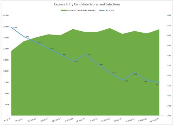 May 31, 2017- Today, the Department of Immigration, Refugees and Citizenship Canada (IRCC) invited 3877 people to apply for Permanent Residence to Canada through Express Entry. The number of invitations issued increased by 190 invitations from the last draw on May 17, 2017. The Comprehensive Ranking System (CRS) score was 413, a further drop of 2 points from the last round.