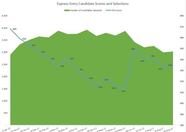 August 24, 2017 - Yesterday, the Department of Immigration, Refugees and Citizenship Canada (IRCC) invited 3035 people to apply for Permanent Residence to Canada through Express Entry. The number of invitations issued increased by 44 invitations from the last draw on August 9, 2017. Candidates in the Express Entry pool for immigration to Canada with 434 or more Comprehensive Ranking System (CRS) points have been invited to apply for Permanent Residence. The CRS cut-off threshold increased slightly by 1 point since the previous draw.