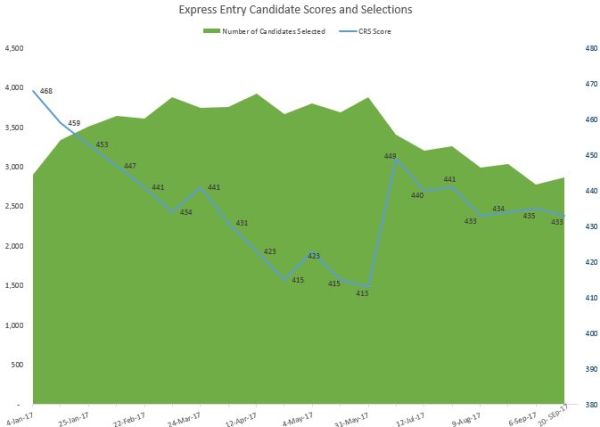 September 20, 2017 - Today, the Department of Immigration, Refugees and Citizenship Canada (IRCC) invited applicants with a Comprehensive Ranking System (CRS) score of 433 to apply for Canadian permanent residence. The CRS cut-off threshold decreased slightly by 2 points since the previous draw. A total of 2,871 invitations were issued in the latest draw from the pool. The number of invitations issued increased by 99 invitations from the last draw on September 6, 2017.