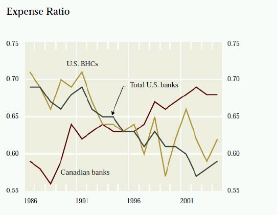 There is always pressure for improvement. However, there seem to be some very specific drivers affecting financial services firms in Canada right now. Over the last 25 years, the efficiency of Canadian banks has been declining. In a study by the Bank of Canada, the non-interest expense ratio has risen from around 58% to approximately 68%. Contrast this to the US banks who have seen the exact opposite trend, with their expense ratio falling from around 69% to about 58%.