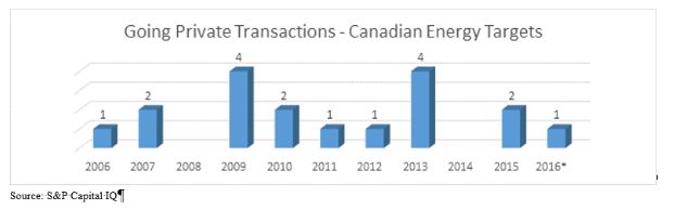 Since July 2015, there have been three private equity-backed going private transactions involving Canadian energy and energy-services companies: Canamax Energy Ltd. (Edge Natural Resources) and Platino Energy Corp. (Denham Capital), both now completed, and Boulder Energy Ltd. (ARC Financial), announced on February 24, 2016. In contrast, there were only 15 going private transactions in the sector during the prior 10 years.