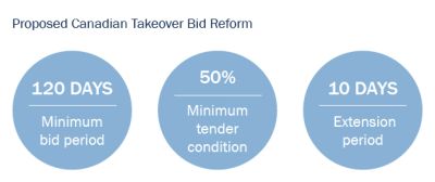 Securities regulators have now abandoned their competing initiatives, and are proposing a new framework intended to balance rather than eliminate the "pro-bidder" elements of Canada's takeover regime. When implemented, the new rules will extend the time that formal takeover bids must remain open to 120 days, giving target boards more time to respond to unsolicited approaches and seek value-enhancing alternatives. The rules will also require formal bids to include a 50% minimum tender condition with a mandatory 10-day extension period if the minimum tender condition is met.