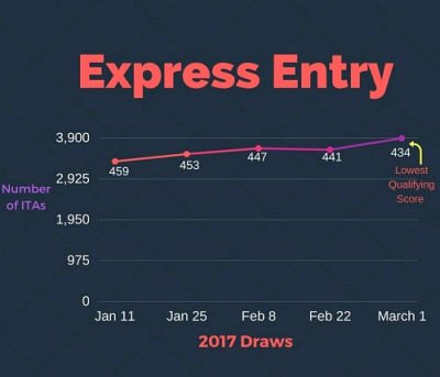 March 1, 2017 - Today, the Department of Immigration, Refugees and Citizenship Canada (IRCC) invited 3884 people to apply for Permanent Residence to Canada through Express Entry. The number of invitations increased by an astounding 273 invitations from the last draw on February 22, 2017. The lowest qualifying score was 434, a drop of 7 points from the last round. This round has surpassed all previous draws and is the largest number of invitations and lowest qualifying score ever pulled since the program began on January 31st, 2015.