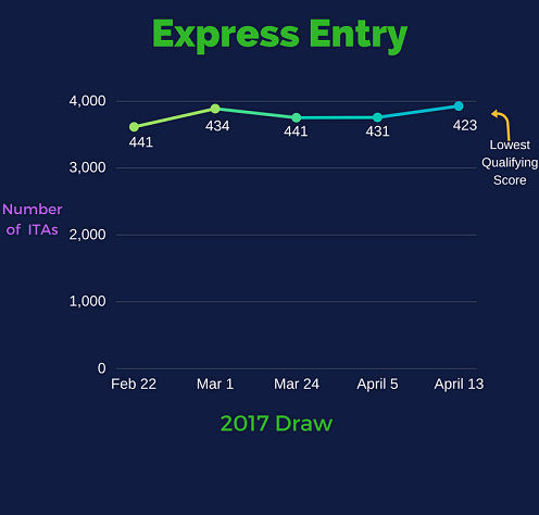 April 13, 2017- Today, the Department of Immigration, Refugees and Citizenship Canada (IRCC) invited 3,923 people to apply for Permanent Residence to Canada through Express Entry. The number of invitations increased by an astounding 170 invitations from the last draw on April 5, 2017. This draw set a new minimum Comprehensive Ranking System (CRS) score of 423, a drop of 8 points from the last round. With a total of 3,923 candidates invited this time around, this draw also marks another new record for the most ITAs issued in any single draw.