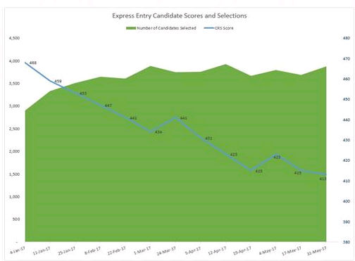 May 31, 2017- Today, the Department of Immigration, Refugees and Citizenship Canada (IRCC) invited 3877 people to apply for Permanent Residence to Canada through Express Entry. The number of invitations issued increased by 190 invitations from the last draw on May 17, 2017. The Comprehensive Ranking System (CRS) score was 413, a further drop of 2 points from the last round.