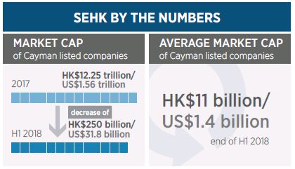 Cayman public companies listed on the SEHK grew to 1,170 in the first half of 2018, representing a 10% increase since the end of 2017. Conversely, the market cap was HK$12.25 trillion (US$1.56 trillion), a decrease of HK$250 billion (US$31.8 billion) since 2017. Despite this, for the end of the first half of 2018, 50% of all SEHK listings were Cayman companies (2% increase on 2017), with an average market cap of HK$11 billion (US$1.4 billion).