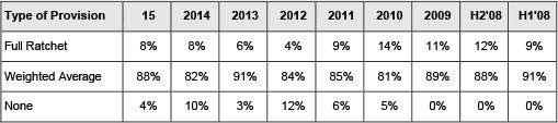 Anti-dilution Provisions —T he use of anti-dilution provisions in the financings which took place in 2015 and in the periods covered by our previous surveys may be broken down as follows: