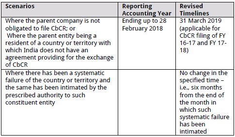 Thus, in certain cases where the obligation to furnish the CbCR rested on the Indian entity, due to certain conditions being met, there was ambiguity in terms of the deadlines for filing of such CbCR by Indian entities, as the same was not yet prescribed for FY 16-17 as well as FY 17-18 compliance. Recently, on 18 December 2018, the CBDT issued its notification wherein the timelines for furnishing the CbCR report were provided in the below scenarios: