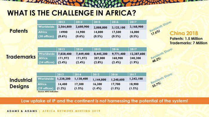 Currently, Africa only accounts for 0.5% of all patents and 1.9% of all trade marks filed worldwide. He proposed that Africa, particularly IP practitioners, overcome this challenge by assuming their role as stakeholders of the IP system and contribute on: