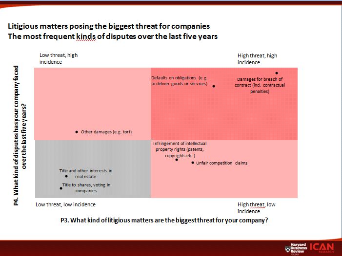 Damages or breach of contract claims are the most feared disputes for a third of the executives surveyed, as are cases involving default or unfair competition claims. These kinds of disputes are also the most frequent. Businesses with a bigger caseload see a threat from disputes involving property interests, IP and title to shares.