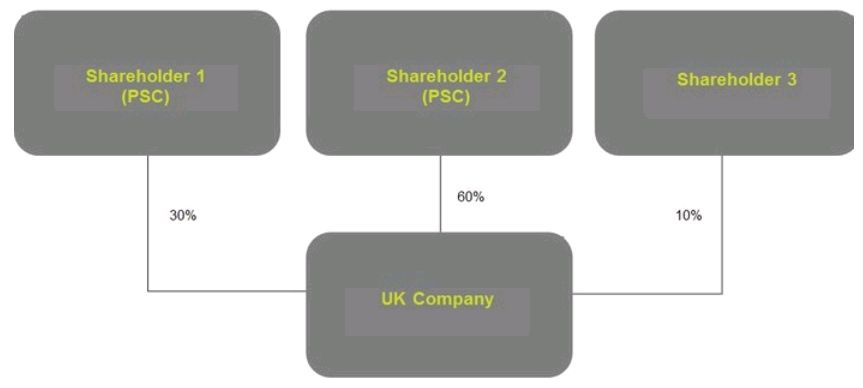 In the following example, Shareholder 1 and Shareholder 2 meet condition 1. If all shares in the company hold one vote each then they will also satisfy condition 2. Shareholder 3 does not meet either of these conditions. However if Shareholder 3, despite his minority shareholding, has the right to exercise, or does exercise, significant influence or control over the company he too would be a PSC.