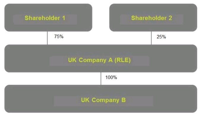 A corporate shareholder can only be classed as a RLE if it meets one of the same criteria for individuals (as listed above, conditions 1-5) and if that entity itself is required to keep its own PSC register. If not, the subsidiary company will need to look further up the ownership chain to identify any registrable PSC or RLE. Otherwise, there is no need to go any further up the ownership chain. In the below example, UK Company A is the only RLE for UK Company B. Shareholders 1 and 2 would only need to be included on UK Company A's PSC register.