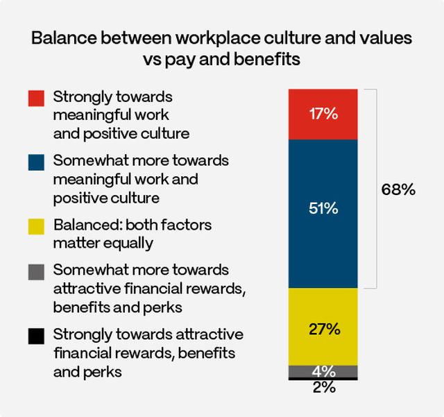 68% of respondents report that their strategies now lean more towards meaningful work, organisational culture, and values than towards pay and benefits. Within this, 17% say they are strongly prioritising these non-financial factors, while a further 51% indicate a more moderate (but still clear) tilt in the same direction. By contrast, only 5% prioritise financial rewards over culture and meaning, and just 1% do so strongly.