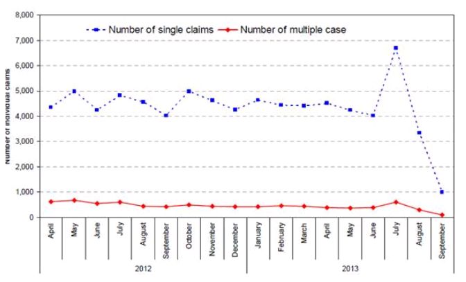 • Following the introduction of the fees system the number of single claims dropped to 3,645 in August and only 1,117 in September.