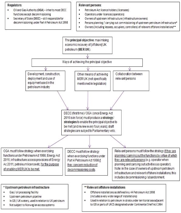 At the heart of the new regime is the concept of "MER UK". This is short-hand for the "principal objective" of "maximising the economic recovery of [offshore] UK petroleum", which is set out in s. 9A of the Petroleum Act 1998 (inserted by the Infrastructure Act 2015). The way that the principal objective governs both the regulators and those they regulate is summarised below.