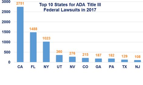 [Graph: Top 10 States for ADA Title III Federal Lawsuits in 2017: CA 2751, FL 1488, NY 1023, UT 360, NV 276, CO 215, GA 187, PA 182, TX 129, NJ 108.]
