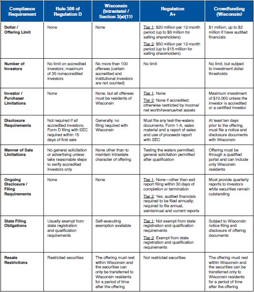 What follows is a brief description of the types of exempt common stock offerings that can be utilized by privately held companies in Wisconsin. We have included a chart at the end which we hope is helpful in reviewing and comparing the various types of exempt offerings.