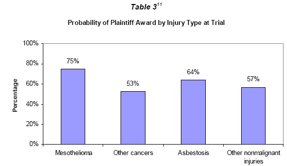 Table 3 demonstrates why mesothelioma cases drive the litigation as 3 out of 4 will result in a plaintiff's verdict.