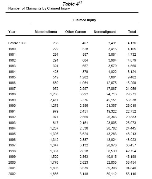 730,000 individuals had filed a claim for asbestos-related injury by 2002.1 Also, by 2002, 8,400 entities had been named as a defendant in the various suits.2 Gross compensation for plaintiffs totaled approximately $49 billion.3 Defense costs accounted for $21 billion or approximately 31% of the total spending.4 Total spending on asbestos litigation rose to $70 billion by 2002.5 That is a sharp contrast to respected analysts who had predicted a total expenditure of $38 billion for that period.