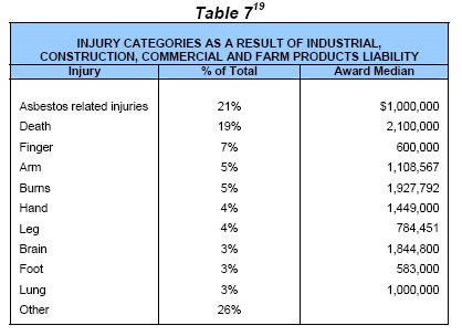 This demonstrates various injuries in product cases from 1995 to 2005 and the percentage of the type of case in relation to all product cases and the award medium. You can see in comparing these results to the asbestos injury result how much more valuable asbestos cases are in relation to all other products cases.