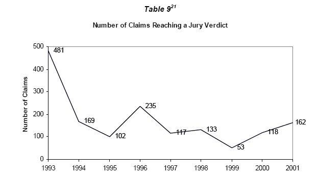 Trials going to verdict are again on the rise. Table 9 shows that defendants continue to litigate these cases in the face of the overwhelming odds in plaintiffs' favor. Nearly one-half of all cases tried involve a claim for cancer (see Table 10).