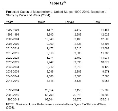 Nicholson, et al., predicted that between 2005 and 2029, there would be 50,770 mesothelioma cases.29 You will note that that does not run out the string of cases as attempted by other authors. Price, et al., predicted 89,305 cases from 2005 through 205030 and the Bates Report predicts 49,000 cases through 2049.31 Clearly, all three prognosticators would agree that there will be a substantial number of cases through 2050 to be litigated.