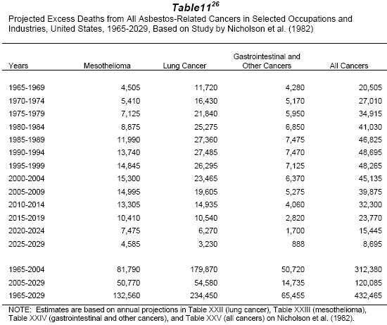 Mesothelioma will continue to drive the litigation. Today, we see more plaintiffs' attorney's firms becoming mesothelioma boutiques, that is, firms handling only mesothelioma cases and refusing pleural changes or asbestosis cases. Many studies, such as Rand, rely on the estimates prepared by Nicholson, et al. (1982).25 Their prediction seems to be fairly accurate as we review what has actually happened in the last 20 years. This prediction assumes: