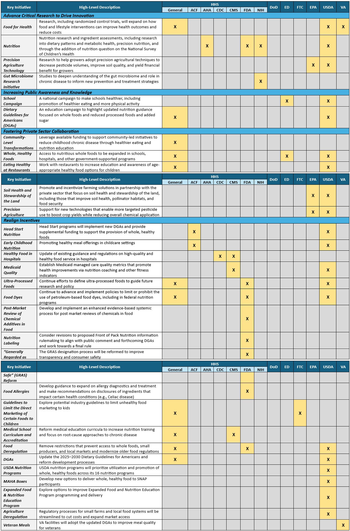 The Strategy Report outlines the Administration's plan to address childhood chronic disease. The report is broad and spans issue areas including vaccines, food, nutrition, chemical exposure, physical activity, and medical practices for a comprehensive overview of the full report). This alert focuses specifically on the Administration's stated goals around food and nutrition and organizes such goals around the federal entities charged with implementation under the Strategy Report. As with most initiatives in the report, the descriptions of these proposed initiatives related to food and nutrition are short on detail and come against a backdrop of significant funding cuts to the agencies and programs charged with their implementation and, more broadly, to Medicaid and the Supplemental Nutrition Assistance Program (SNAP) under HR 1. Recognizing the current uncertainty around next steps, stakeholders with an interest in these areas have an opportunity to engage with federal entities and explore what action could look like in these spaces.