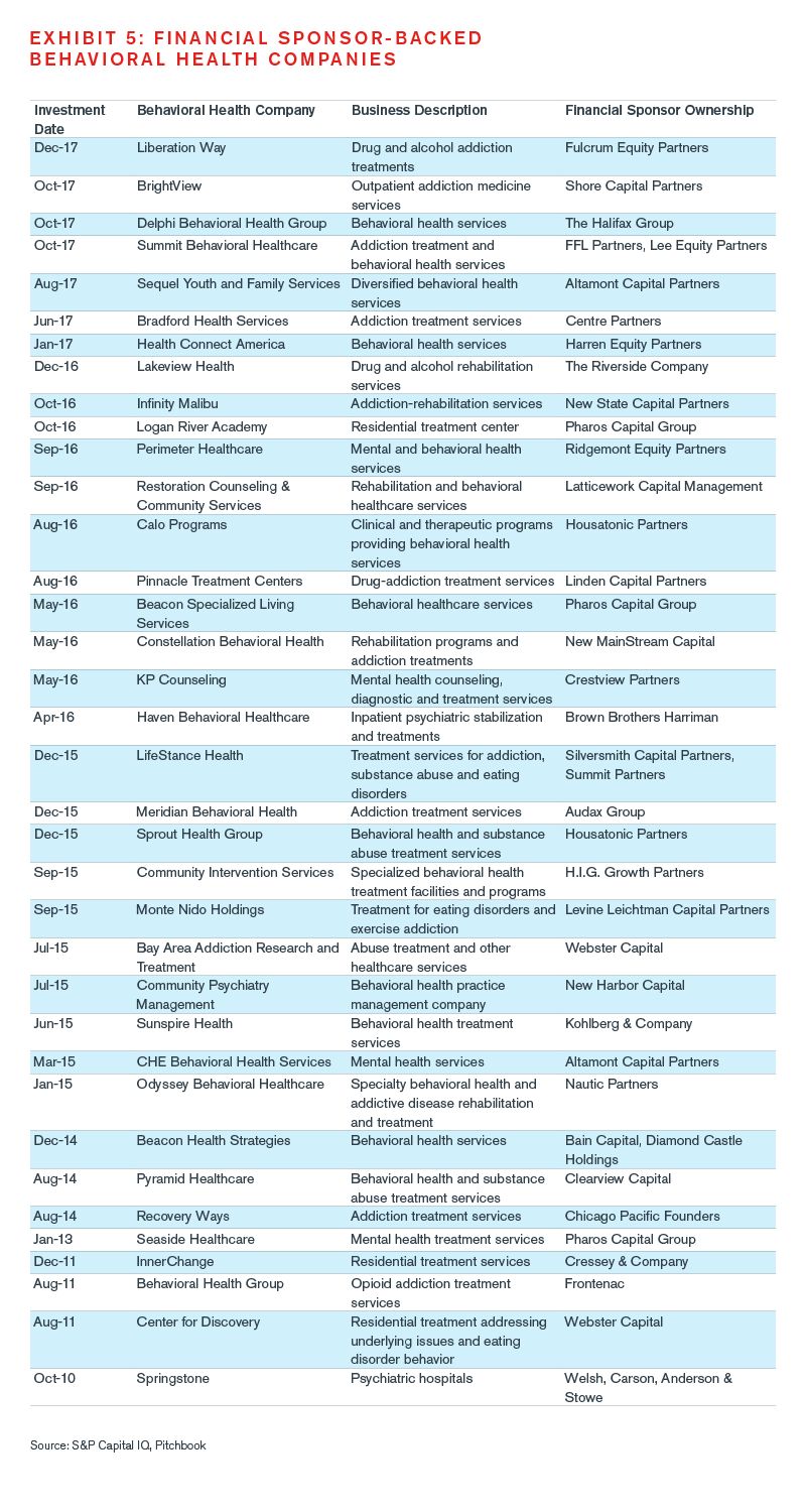 Given the continuing imbalance between patient demand and patient access to care, provider market fragmentation, and continued expansion of reimbursement based on the continued implementation and enforcement of federal mental health parity laws, we expect to see continued growth in deal volume in the area of behavioral health in the years to come.