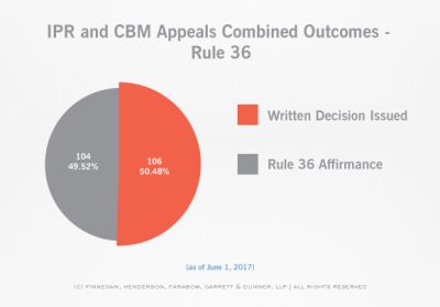 Through June 1, 2017, the Federal Circuit decided 210 PTAB appeals from IPRs and CBMs. The Federal Circuit affirmed the PTAB on every issue in 155 (73.81%) cases, and reversed or vacated the PTAB on every issue in 22 (10.48%) cases. A mixed outcome on appeal, where at least one issue was affirmed and at least one issue was vacated or reversed, occurred in 23 (10.95%) cases.