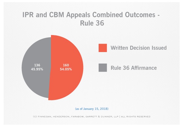 Through January 15, 2018, the Federal Circuit decided 296 PTAB appeals from IPRs and CBMs. The Federal Circuit affirmed the PTAB on every issue in 219 (73.99%) cases, and reversed or vacated the PTAB on every issue in 34 (11.49%) cases. A mixed outcome on appeal, where at least one issue was affirmed and at least one issue was vacated or reversed, occurred in 31 (10.47%) cases.