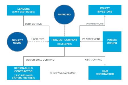 Through the P3 agreement (between the public owner and the developer's special-purpose project company), the owner "concedes" the project for an extended term to the project company. The developer is responsible for securing all or a portion of the project's financing, generally through a combination of debt and equity. Under the design-build-finance-operate-maintain (DBFOM) model, the project's revenue streams (e.g., tolls, fare box collections or lease payments) are used to service the debt and provide a return on equity.