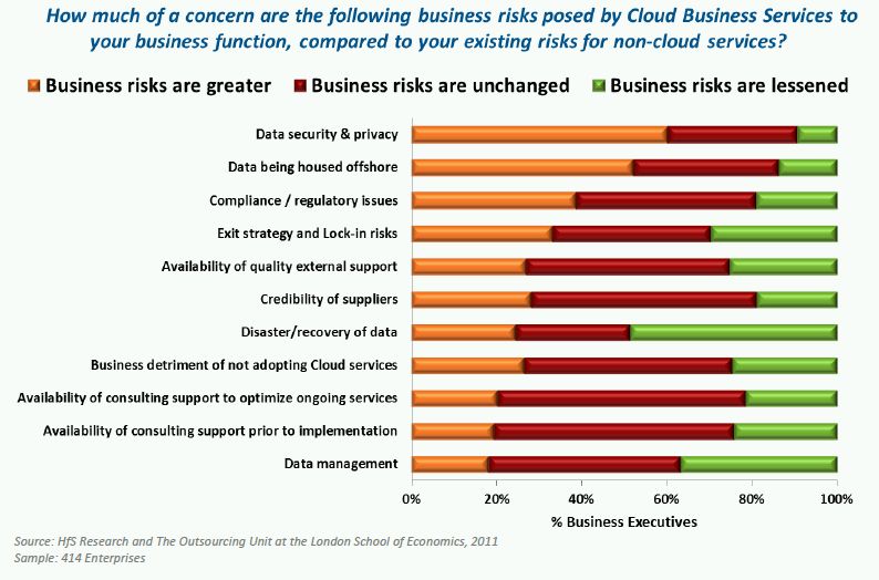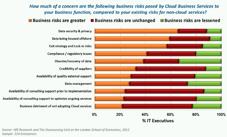 The reality of the Cloud today is that it is a nascent set of technologies and services that is seeing fast adoption in the market but the market itself is in danger of boiling over in terms of inflated expectations. HfS wants to calm some fears as our recent survey conducted with The Outsourcing Unit of the London School of Economics highlighted that both IT and business executives do maintain concerns about adopting the Cloud (see Exhibit 1 and 2) and are planning accordingly. Business executives are concerned about the location of their data, their secure access to it, but are less concerned about the underlying technology.
