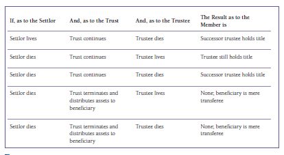 What happens when the settlor of a trust dies? The answer depends on whether the trust continues or terminates as a result of the settlor's death. If the trust continues, the trustee of the trust continues to hold the membership interest as trustee. If the settlor is also the trustee of the trust, upon the death of the settlor/ trustee, a successor trustee would be appointed and the successor trustee would be substituted for the deceased settlor/trustee to hold title to the membership interest as trustee. As a result, if the trust continues upon the death of a settlor, there is no event of dissociation. If a trust is a revocable trust and becomes an irrevocable trust upon the settlor's death, the result is the same. The change in the trust from revocable to irrevocable has no bearing on the status of the trustee or successor trustee holding title to the membership interest of the LLC.8